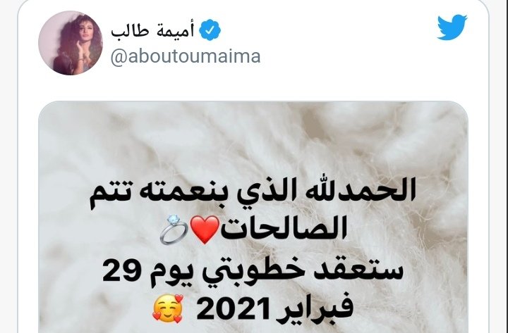 ونشرت طالب عبر صفحتها الخاصة على موقع التواصل الإجتماعي صورة كتبت فيها:”الحمدالله الذي بنعمته تتم الصالحات ستعقد خطوبتي يوم 29 فبراير2021″.