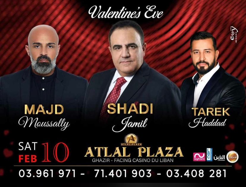 بمناسبة عيد العشاق، سهرة حب بامتياز في مطعم الأطلال بلازا – طبرجا، يحيها الفنان مجد موصلي و شادي جميل و طارق حداد ليلة ١٠ فبراير